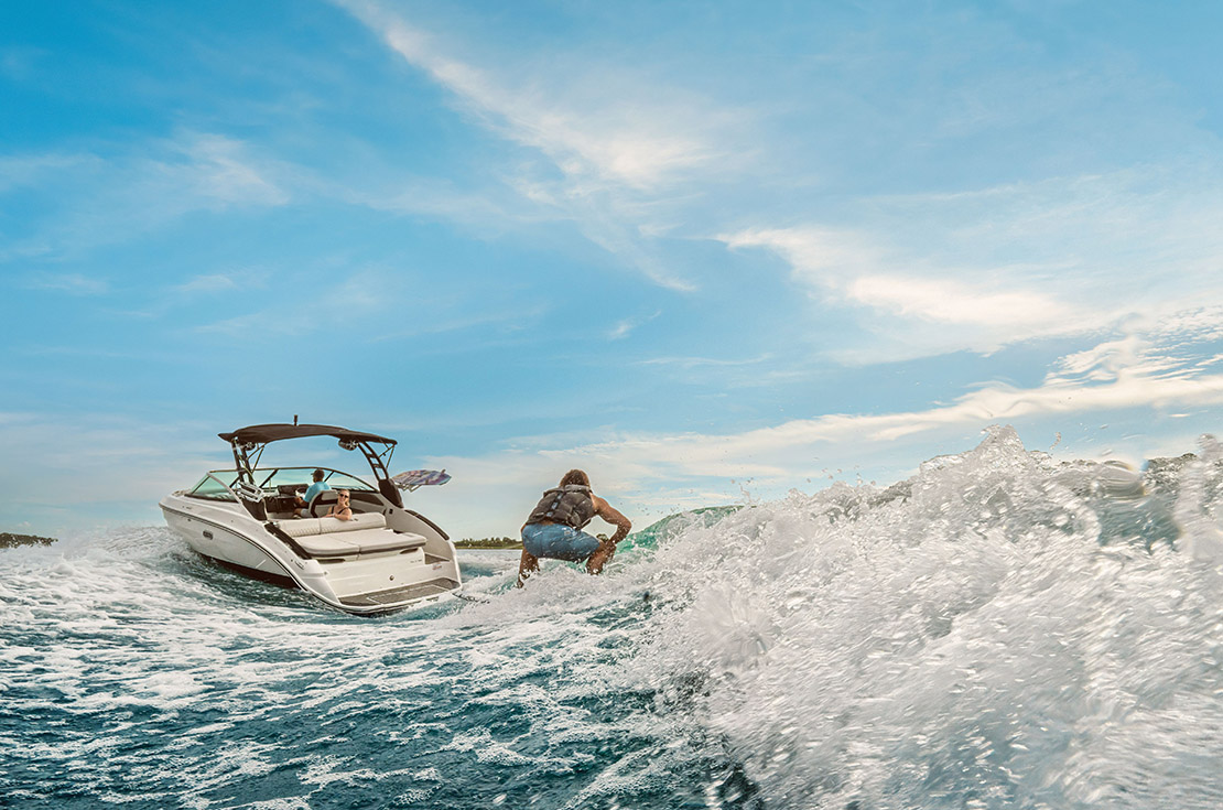 A Sea Ray always performs with grace. Every ride is engineered to be agile, responsive, intuitive and as powerful as you want it to be. You won't sacrifice experience for maximum horsepower. On a Sea Ray, your ride is smooth and quiet, with everything controlled but the adrenaline rush. It's built to handle with confidence, whether you're towing a wakeboarder or effortlessly maneuvering up to the dock. Escape and adventure. Both are seamlessly delivered.
